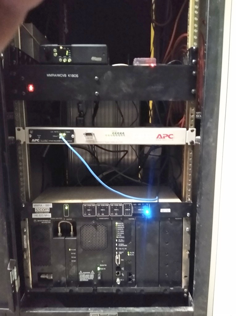 Our site host provides us with about 3 feet of rack space. The Motorola GM300 transceiver, used for linking to the MMRA network, is at the top. Below that is the Astron power supply which powers the link radio. Next in line is the APC remote power switch - this allows us to cut power to the repeater, link radio, or Raspberry Pi processor board from any remote location with internet. The SCOM controller is next, then finally the Motorola Quantar at the bottom. Not seen are the bandpass filters which are a requirement in the intense RF environment on the roof. Both the VHF repeater and UHF link radio have 4-cavity DCI bandpass filters on them. |