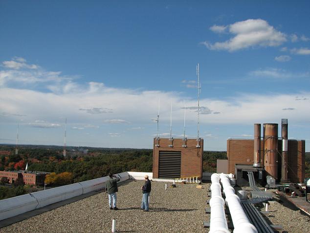 ![]() The small vertical antenna on the left and the 4-bay dipole on the right have been relocated to the North Reading site. The corner reflector on the left is the current link antenna. The second antenna from the left is a 6m/2m/440 triband and is a spare. The third antenna is a 2m/222/440 tribander and serves as the main repeater antenna. | |