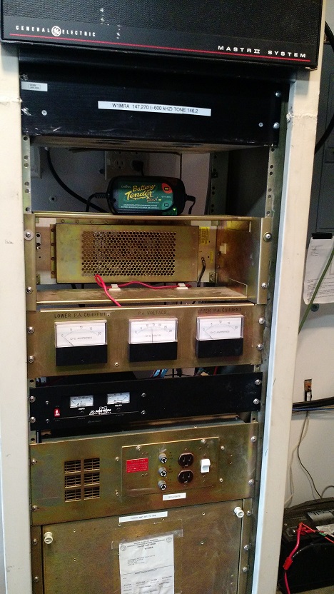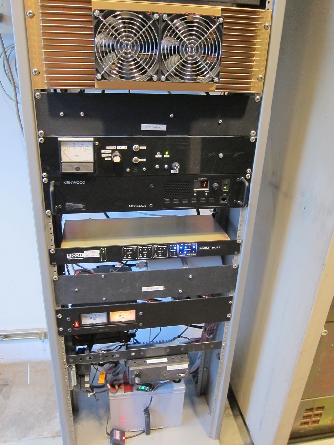 | This is the center of MMRA's network. All repeaters in our network link through here. At the top in the photo is the final amplifier. Below this, you can see the monitor panel followed by the Kenwood NXR-810 repeater installed in 2018. Below this you can see the SCOM 7330 repeater controller followed by a preselector. The Astron switching power suppy is next and below this you can see the Motorola M120 link radio, which allows '925 to link to 443.500 in Hollis, NH or 446.325 in Natick. At the bottom, 449.925 is equipped with battery backup power and can operate thirty to sixty minutes during a power outage. | |