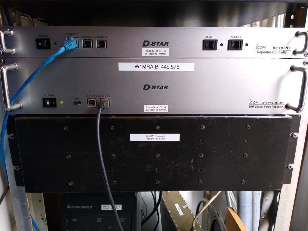 "W1MRA B" is the newest addition to the Marlborough site. On loan from N1PA, this is the second D-STAR repeater sponsored by MMRA. Below the ICOM stack, you see the duplexer, and below that the Dell workstation in service as the gateway. Note: On March 4, 2024, to reduce interference at the Hopkinton site, Marlborough Dstar's frequency was swapped with Hopkinton. The previous frequency was 448.225. |