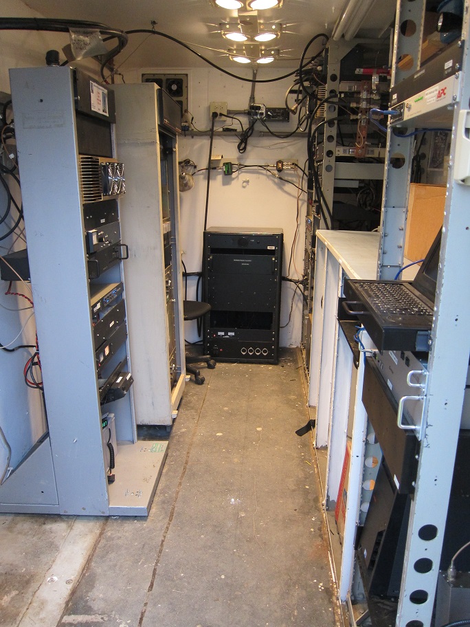Here is your first look inside the shelter. 449.925 and 147.27 are on the left. In the back is the previous 223.94 repeater (replaced in 2022 by an MX800). On the right side (front to back) we have the IRLP computers and DStar repeater, a work bench, then the remaining equipment: APRS, 52.81 rx, and 927.7. |