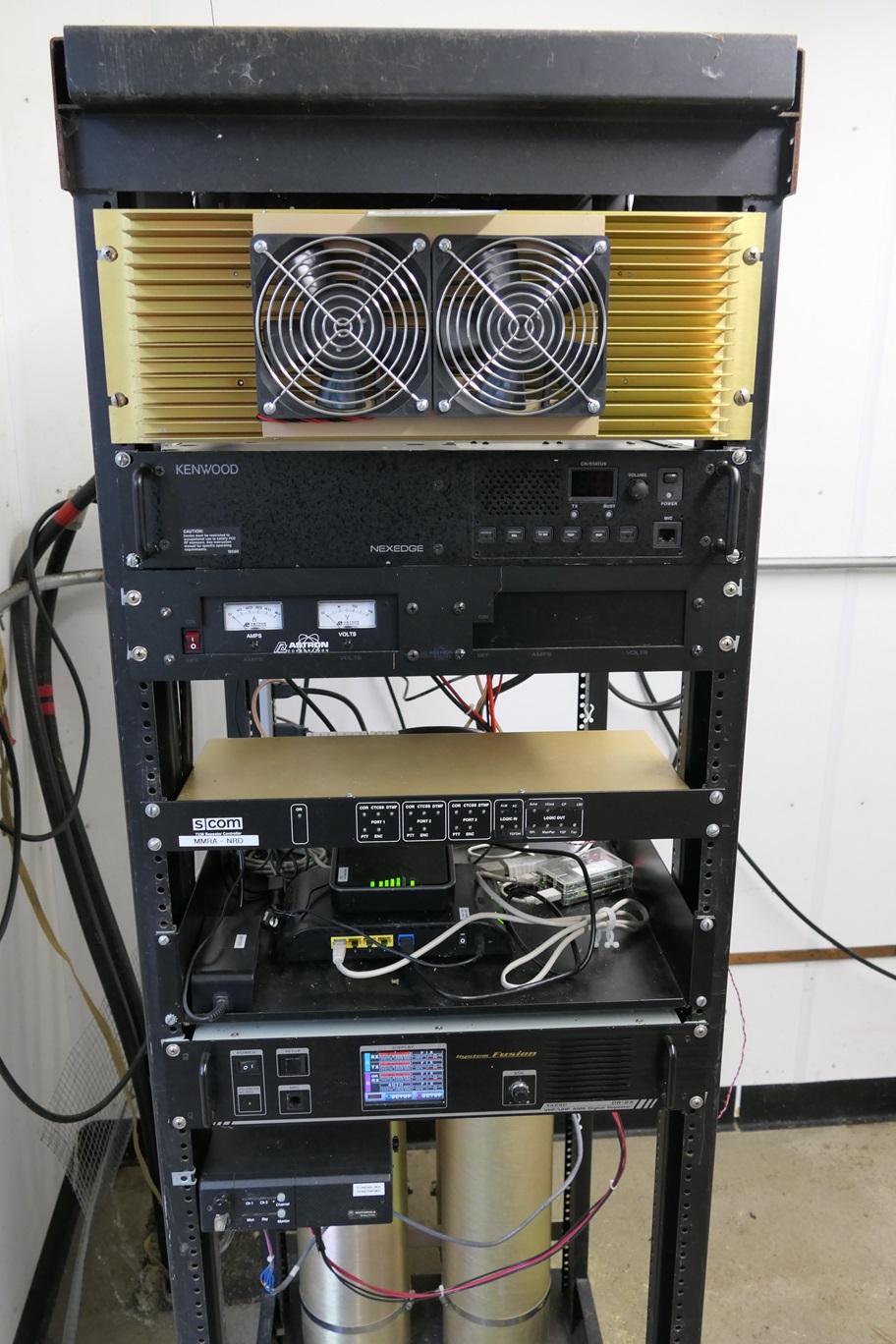 The North Reading repeater is built in a six foot rack. The current configuration was installed on December 2, 2023. The VHF repeater is at the top of the rack: A Henry Radio power amplifier: 5.5W in, 80W out, a Kenwood NXR-710 repeater, and the Astron power supply. Next down the rack is the SCOM7330 that controls both VHF and UHF. Below that is our internet connection equipment. The UHF repeater, a Yaesu DR2X is next and final a Motorola M120 transceiver used for linking to the MMRA network. At the bottom, toward the rear of the cabinet, you can partially see the 2m duplexer. | |